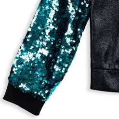 - Fashionable and fun purple to teal blue gradient sequin sleeves with mesh backing and black metallic coat body and notched collar