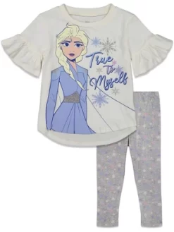 Explore the kingdom of Arendelle with the magical characters of Frozen! Queen Elsa, Princess Anna, Kristoff, Olaf and Sven need all the help they can get to run the kingdom, control Elsa’s wintry elemental powers, and keep the peace with the Northuldra of the Enchanted Forest. Get your little one ready for the storybook, fairy-tale adventure of a lifetime with this Disney Frozen T-Shirt & Leggings. Your child will look so adorable in this graphic tee shirt and cute and stylish leggings featuring their favorite animated movie and short film characters, they will always love wearing it.