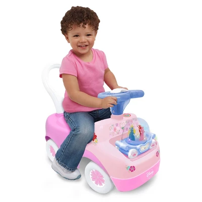 Ride-on plays sounds and has flashing colorful lights! See Princesses rotate to flashing lights for animated action and fun inside magical pumpkin carriage! Dashboard with fun interactive electronic activities. Features colorful piano keys to compose and play music. Safe and durable construction for hours of riding fun.